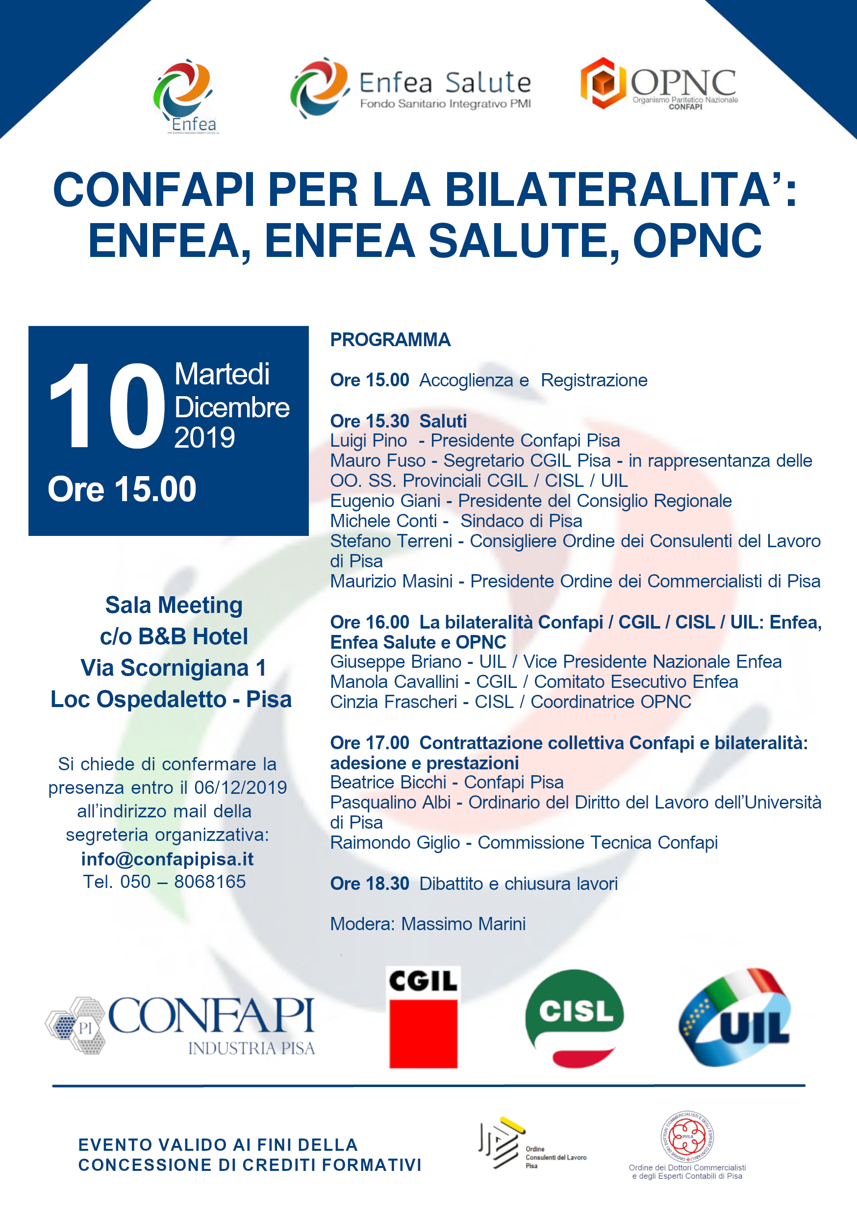Confapi, Enfea, Enfea Salute e OPNC in collaborazione con il nostro Ordine e quello dei Consulenti del Lavoro di Pisa ha organizzato per il prossimo 10 Dicembre 2019 il convegno: